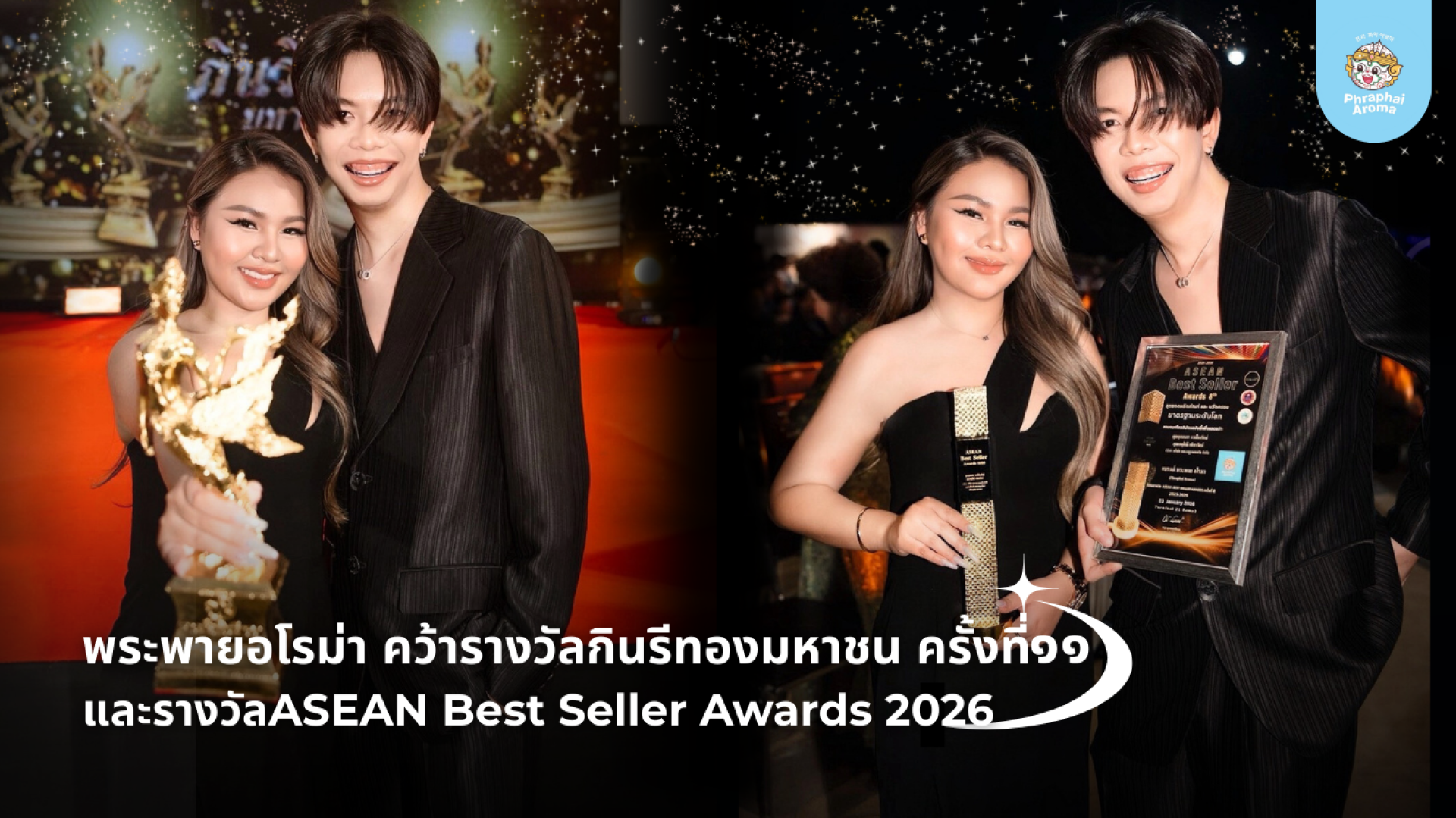 โดยคุณไม้ อุดมเดช นาเมืองรักษ์ และ คุณโรส เกตุศิณี เพ็ชรรัตน์ ผู้บริหารแบรนด์ พระพายอโรม่า (Phraphai Aroma) ได้ขึ้นรับรางวัล ASEAN Best Seller Awards 2026 และ รางวัลกินรีทอง 2026 ท่ามกลางบรรยากาศแห่งเกียรติยศและความภาคภูมิใจ